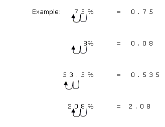 Once you have the decimal equivalent of the percentage, you then follow the same rules that apply to a regular percentage. Divide the number by 100, or more simply, move the decimal to the left twice. Thus: