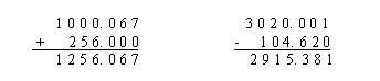 When you are either adding or subtracting decimals, it is important to make sure that they are properly aligned. All of the thousands, hundreds, tens, ones, tenths hundredths, etc have to be placed one on top of each other in the proper order. For example if you were adding 256 to 1000.067 or subtracting 104.62 from 3020.001, the equation would have to be aligned as follows:
