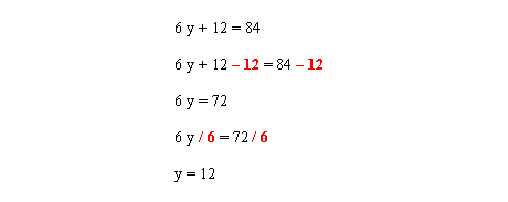 In order to isolate the “y” first eliminate a + 12 on the left hand side of the equation. Subtract 12 from both sides. You are left with 6y = 72. To isolate “y”, now simply divide both sides of the equation by 6.