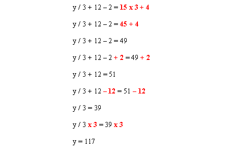 When solving equations, follow the order of operations, which dictate that you perform equations within brackets, followed by exponents, then division and multiplication, and finally addition and subtraction. When isolating unknown variables, use the opposite order. We will not cover solving equations with exponents at this level.