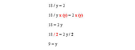 One other tricky situation you may encounter is when “y” appears on the bottom of a division equation. In order to solve for “y”, move it from the bottom of the division sign by multiplying both sides of the equation by “y”. The result is 18 = 2 y. Now solve the rest of the equation.