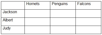 Jackson – Hornets Albert – Falcons Judy - Penguins