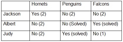 Jackson, Albert and Judy each play on different sports teams. Judy does not play on the Falcons. Albert played against Jackson`s team which was the Hornets. The other team is the Penguins. Who plays on what teams.