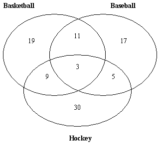Finally the players only playing one sport are separated by taking the total number of players in a sport (47 in hockey) and subtracting the hockey players already accounted for (3 playing all three sports, 5 playing hockey and baseball, and 9 playing basketball and hockey). The result is 30.